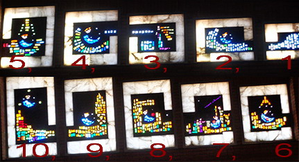 Desde ese simbolismo aparecerá la Virgen María en todos los vitrales y Cristo en la tonalidad roja. Rojo que va creciendo hasta la explosión final de la Eucaristía (último panel).
